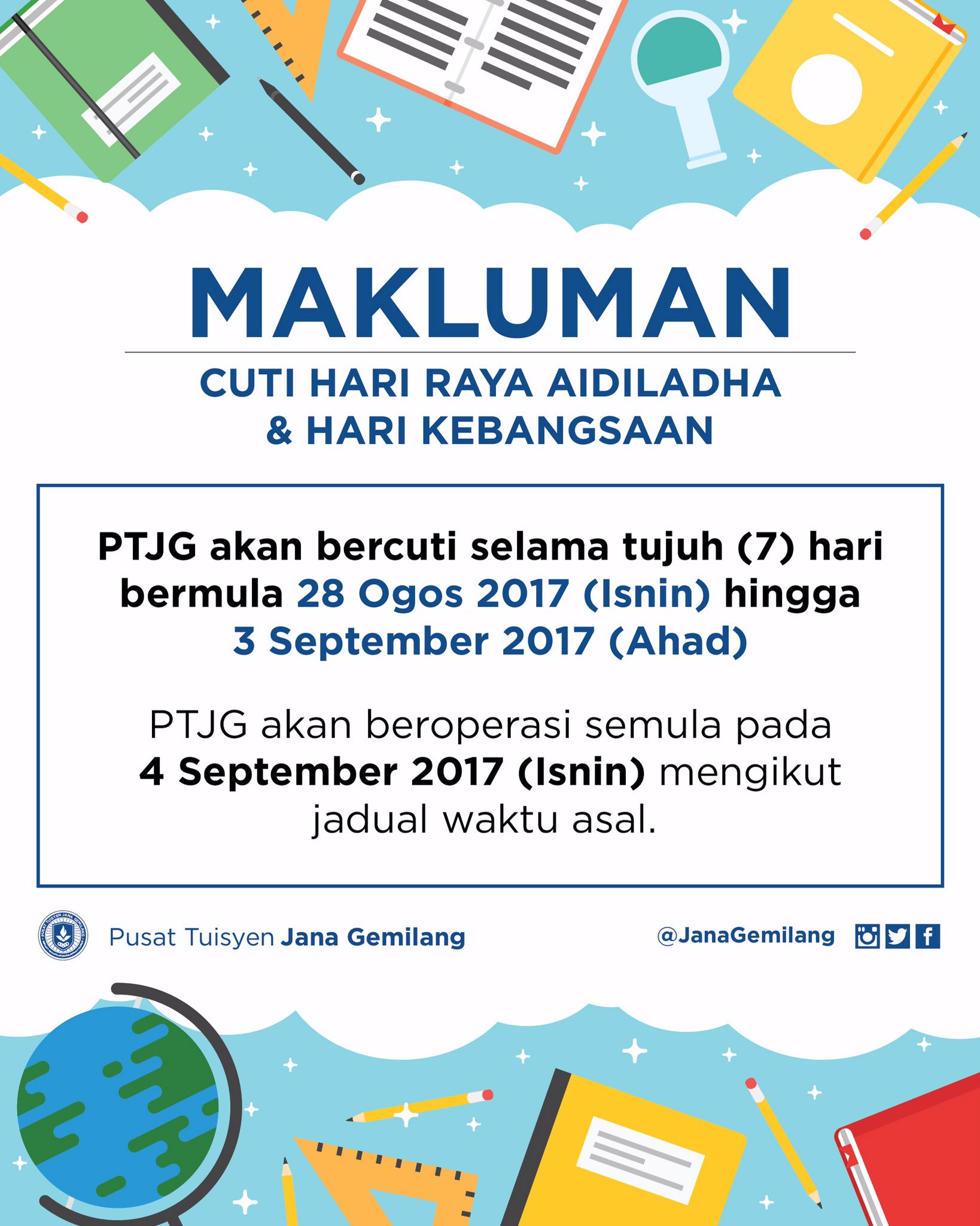 Jana Gemilang V Twitter Pengumuman Cuti Hari Raya Aidiladha Amp Hari Kebangsaan 28 Ogos 3 September 2017 Https T Co Wmptkwvaoy Twitter